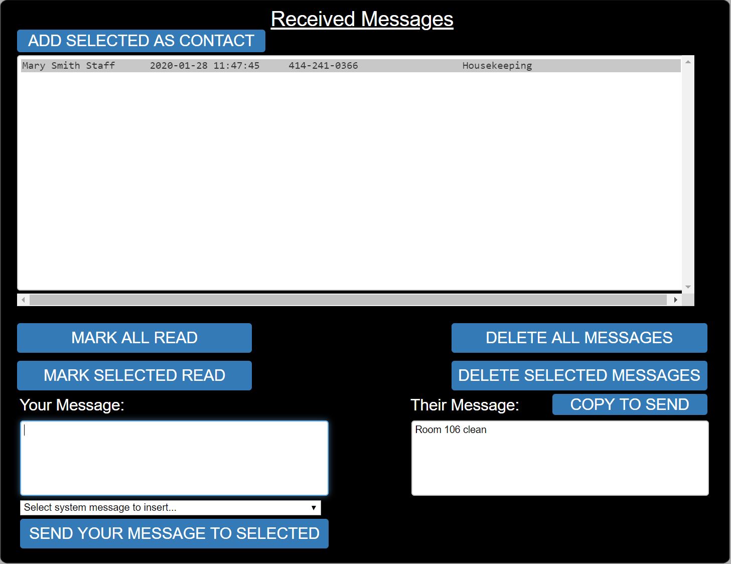 Room status updates can be sent to the front desk by staff members' cell phones or using hotel room phones. Messages appear in the front desk inbox, but tagged with the category 'staff'.