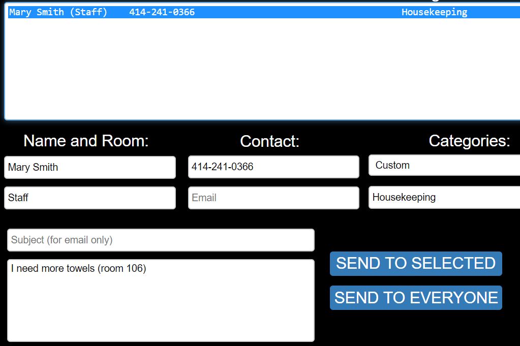 Throughout the guest's stay, you can send text messages to a single guest, all guests, or a category of guests. You might notify guests of hotel events or specials, update a wedding party on their schedule, notify a waiting guest that their room is ready, etc.